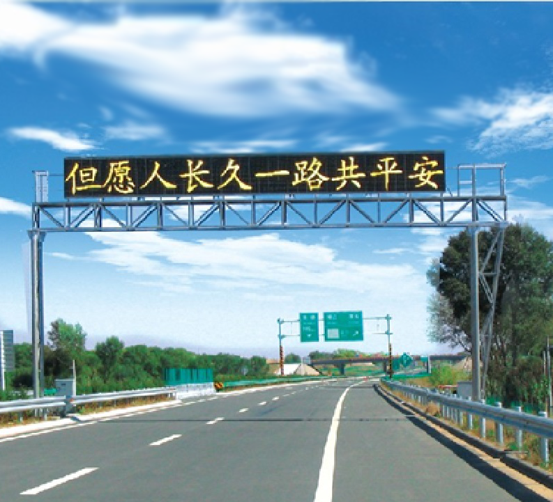 V8420型門架式可變信息情報板由門架、LED顯示屏、控制器、供電系統(tǒng)、通訊系統(tǒng)組成,安裝于高速公路車道正上方,由監(jiān)控平臺控制,可顯示文字及圖形,用于向駕駛員發(fā)布路況、誘導(dǎo)、宣傳及警示信息。
